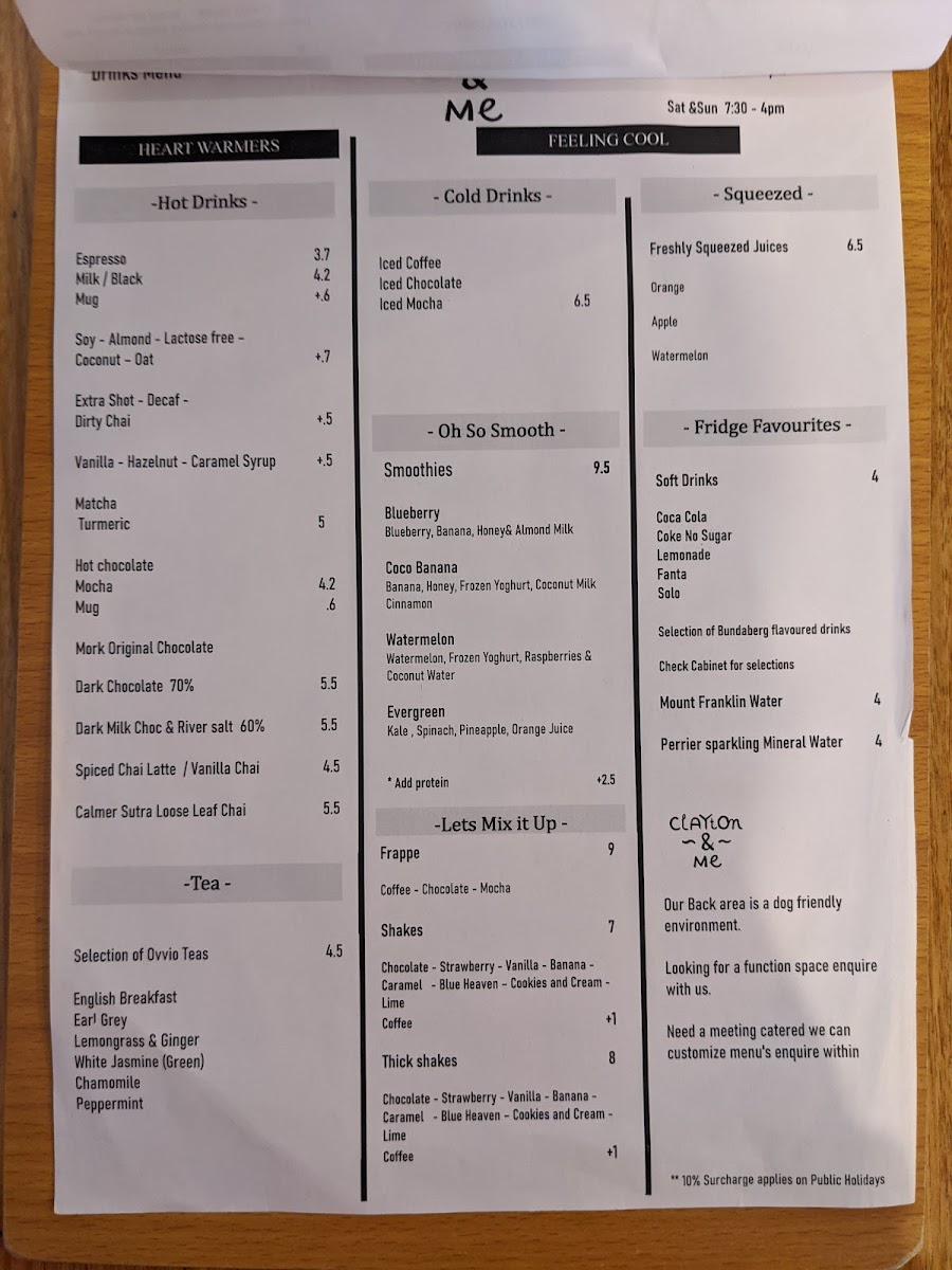 The classics are not to be missed; the Chicken Schnitzel and creamy Carbonara resonate well with local diners. Freshly squeezed juices—orange, apple, and carrot—offer a refreshing complement to any meal. Patrons rave about the rich, flavorful coffee made from quality Code Black beans, solidifying Clayton & Me's status as a coffee haven.